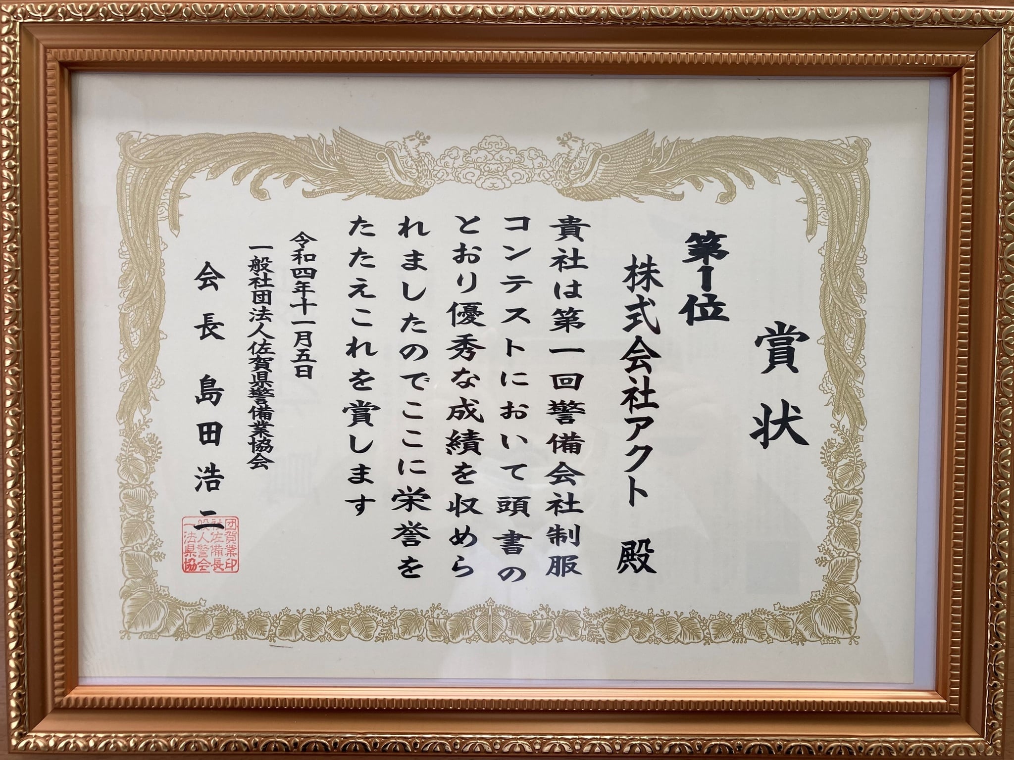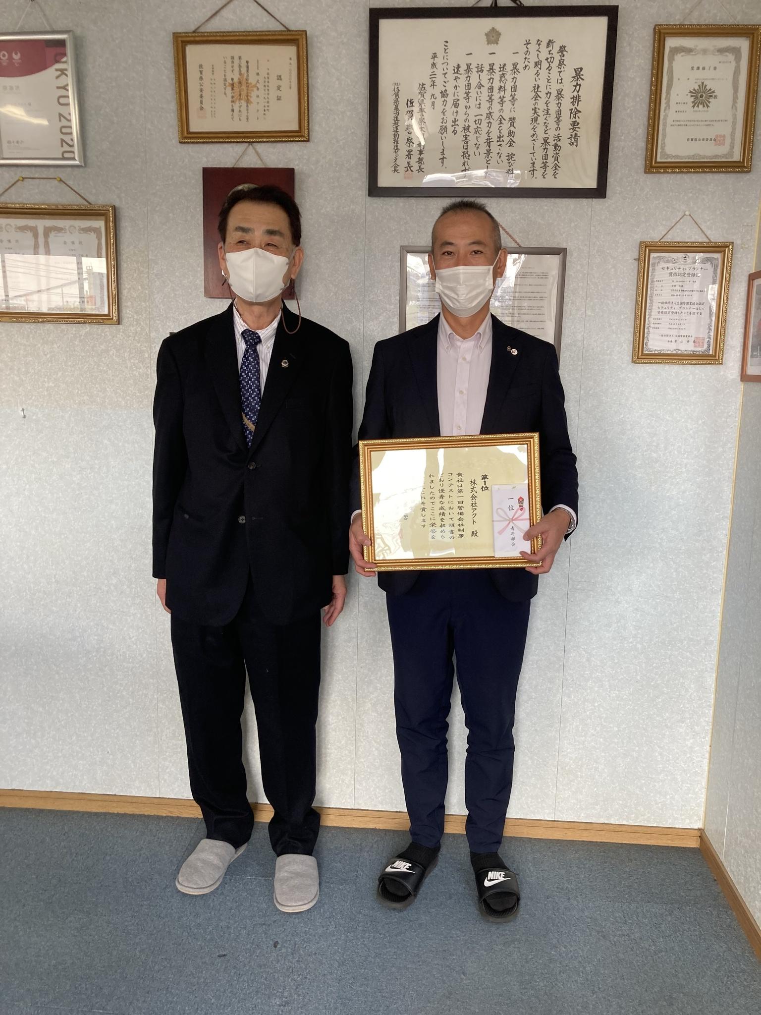 本日、一般社団法人佐賀県警備業協会より、賞状の授与がありました。